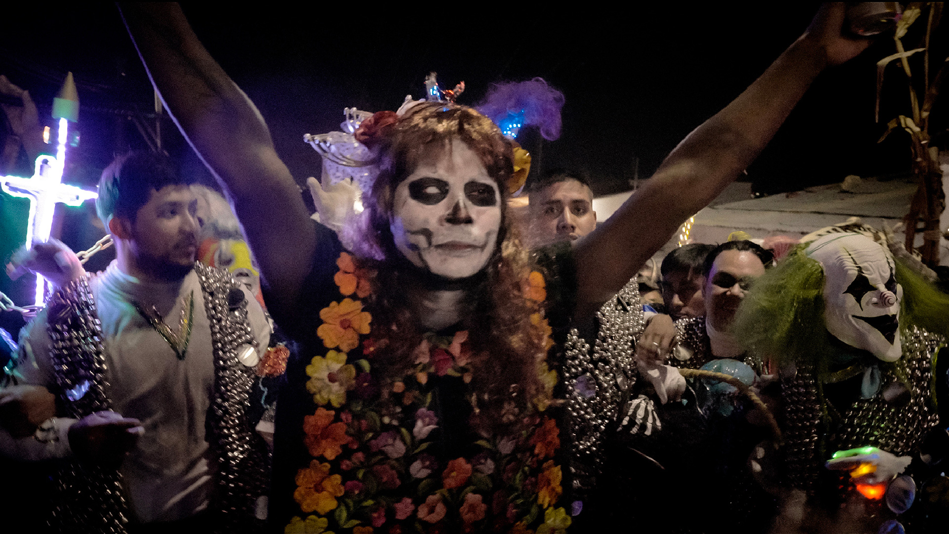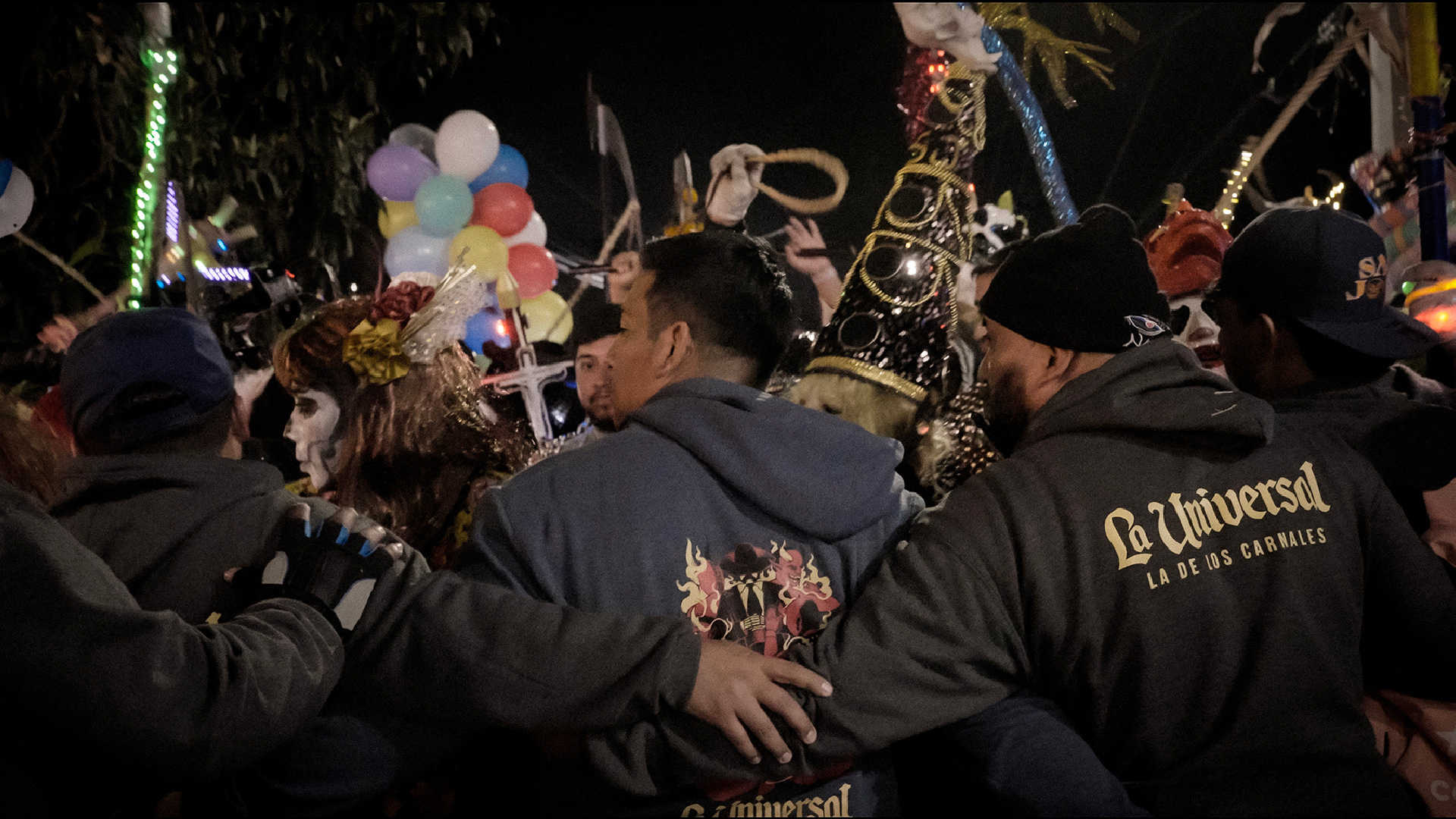 Lors d’une résidence du CALQ à San Agustin Etla, Oaxaca, Mexique en 2019, nous avons pris contact avec la population qui nous a fait connaître les rituels associés à la fête des morts. Puis, la pandémie nous a réfléchir à notre manière d’entrevoir notre relation avec nos défunts. Au Mexique, les célébrations associées au Dia de los muertos datent de plus de 3500 ans, elles ont lieu dans tout le pays entre la fin du mois d’octobre et le début du mois de novembre, lorsque la récolte du maïs est terminée. Les familles se préparent durant plusieurs jours pour accueillir les âmes de leurs proches qui reviennent sur terre pour leur rendre visite. Parfois, ils érigent des autels décorés et parés d’offrandes dans leur maison pour accueillir leurs défunts qui sont de passage dans le monde des vivants. D’autres se rendent directement sur la tombe pour manger, boire et discuter avec le mort. Cette fête est tellement importante qu’elle a été reconnue par l’UNESCO comme patrimoine culturel immatériel de l’humanité en 2003. Au fil du temps et dans certains états du Mexique, les rituels qui entourent cette tradition se sont transformés pour donner des variantes qui ont conservé le symbolisme relié à la fête. Dans la municipalité de San Agustín Etla, la population s’est appropriée cette tradition pour l’adapter à l’identité de la communauté, elle a appelé « la Muerteada ».