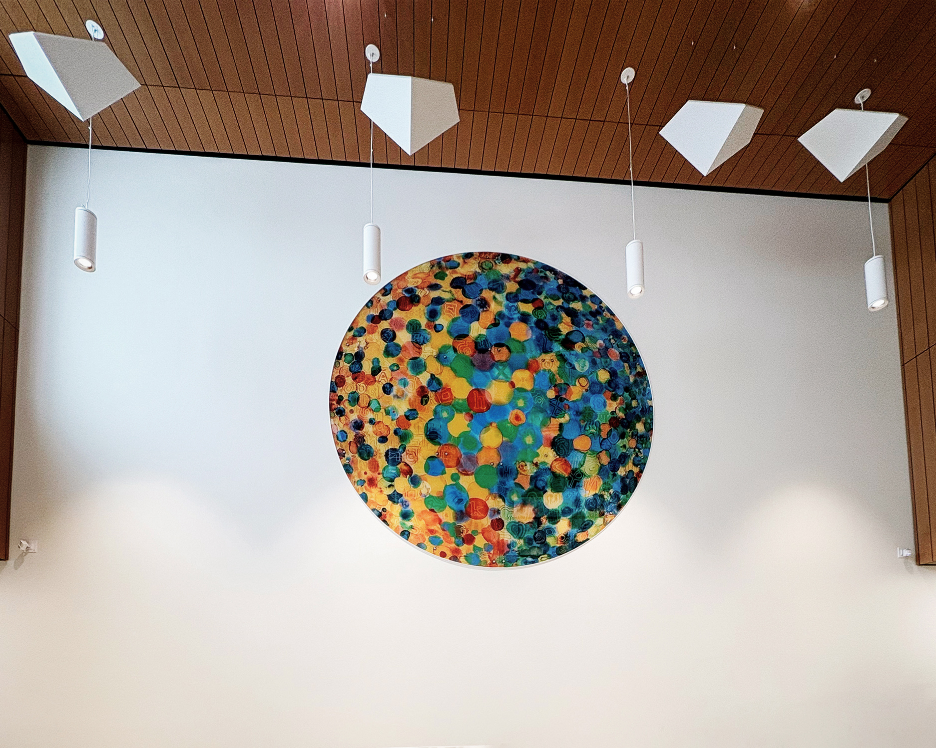 Lorsque les gouttes tombent sur le papier, elles se croisent et, ou se superposent créant ainsi des cercles uniques qui communiquent entre eux. L’utilisation du cercle est inspirée des cercles de discussion, également appelés