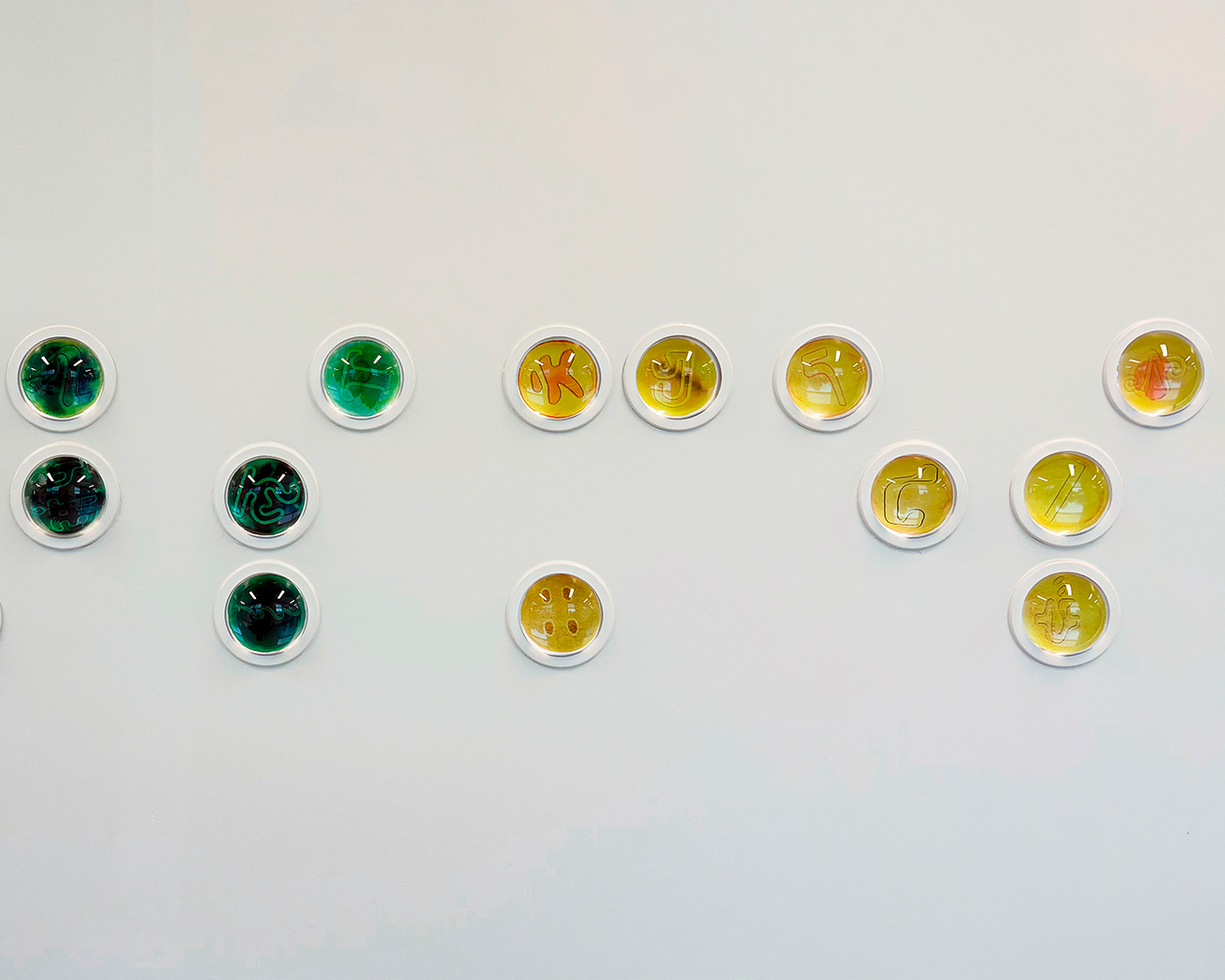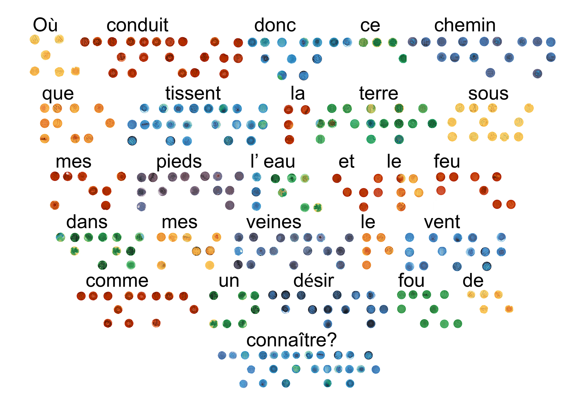 Nous avons donc, comme des enfants, expérimenté et joué avec l’encre et le papier sur lequel nous avons laissé tomber près de 500 gouttes que nous avons photographiées pour y insérer, à partir d’outil numérique, un symbole des 24 systèmes d’écriture répertoriés par M. Cattelain.