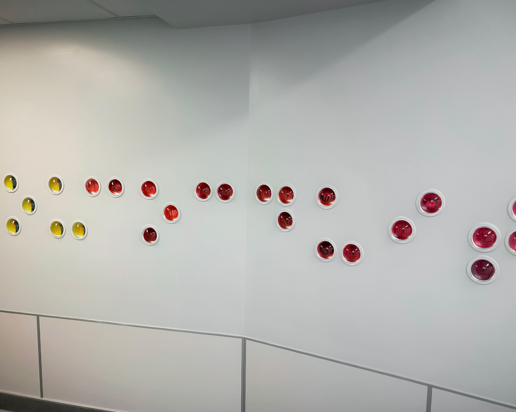 La phrase est écrite en braille Latin sur les deux murs du passage. Le braille est un moyen de communication important pour les non-voyants et dont la forme circulaire, au touché est un code employé par la majorité des langues parlées de notre époque. Chacun des mots du poème est représenté par des gouttes d’encre de teintes différentes, imprimées sur un verre posé sous une demi-sphère semblable à une loupe et encastrée dans le mur afin de représenter la forme tactile du braille.